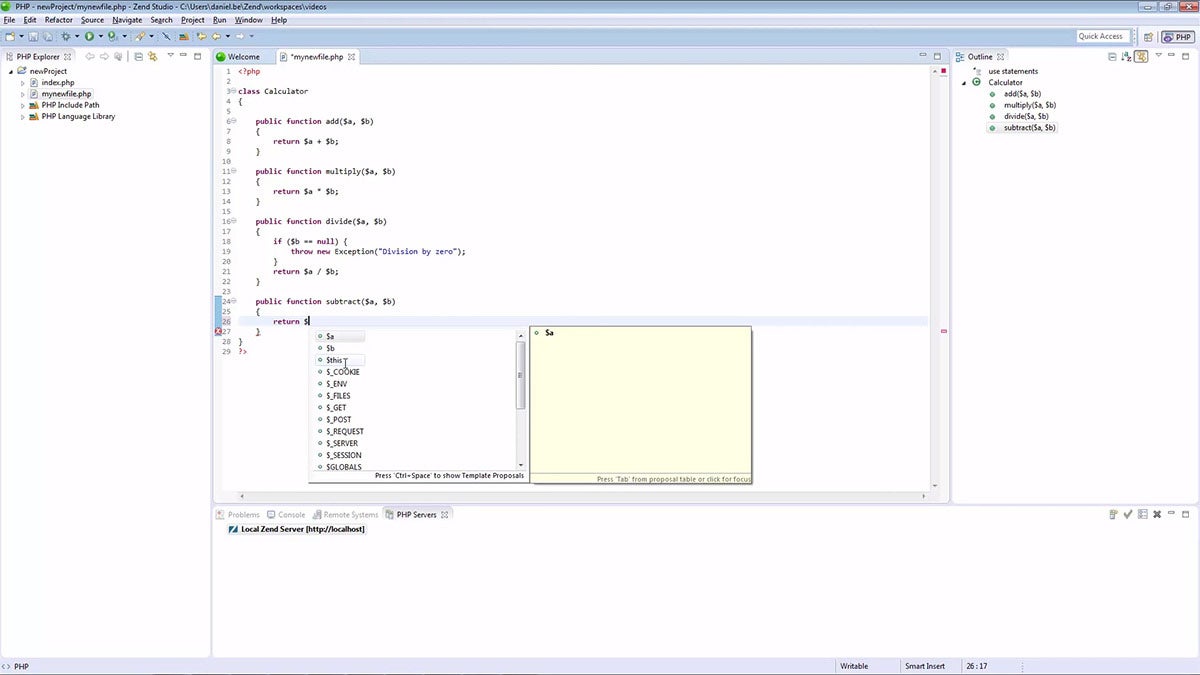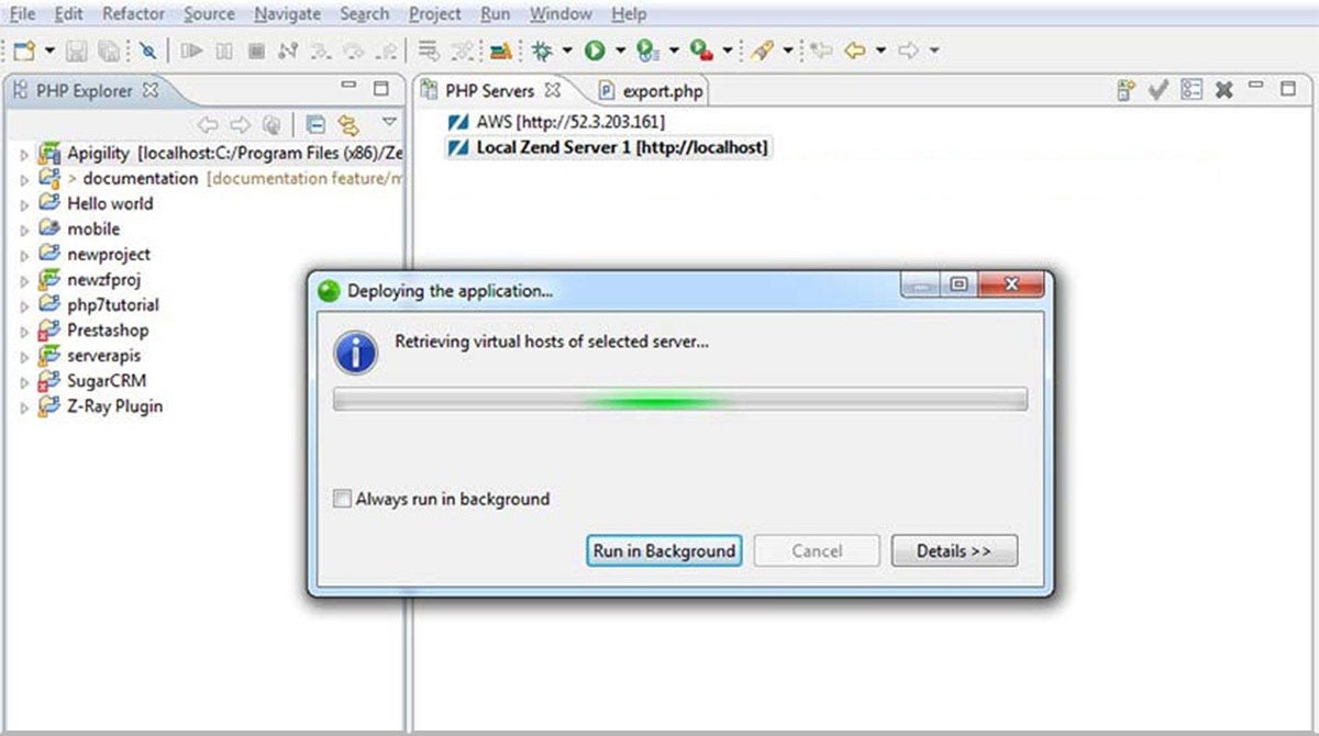 Code EditorYou can save time using features in the intelligent code editor including intuitive code assist, smart code completion, refactoring, and real-time error validation and analysis. The intelligent code editor also supports the latest PHP 7, as well as the older versions of PHP for compatibility with legacy projects. And you can use it with HTML, CSS, and JavaScript.Zend Studio also includes split-editor functionality and multi-cursor support.Debugging and PHP ProfilerZend Studio supports Xdebug, Zend Debugger, and Z-Ray in Zend Server. You can dramatically boost efficiency by using Z-Ray with Zend Studio. Z-Ray provides real-time debugging and application-performance insights, along with other capabilities. And, if you have both products, you can open a debugging or profiling session in Z-Ray — and then fix the code and performance issues using Zend Studio.Source Control, PHP Unit Testing, and Built-In ToolsEnhanced source control integration helps you work smoothly with SVN, CVS, Git, and GitHub. You can easily import existing repositories into your workspace and collaborate with other team members.Streamlined PHPUnit workflows for writing and running unit tests can help you write more reliable code.The integrated PHPDocumentor 2 facilitates a quick and easy generation of user-friendly documentation.Zend Studio also gives you access to the Eclipse Marketplace, which includes an extensive ecosystem of add-on features and plugins.Integration With Popular TechnologiesDocker SupportZend Studio includes new Docker tooling that supports the management of Docker images and containers. As a result, you can run, test, and debug PHP applications in Docker containers.Git Flow SupportZend Studio integrates with EGit 4.2 and 4.3, so you can use the Git Flow branching model . Installation as an Eclipse PluginZend Studio is based on the latest version of Eclipse. So if you already use Eclipse as a development platform, you can install the Zend Studio plugin directly from your development environment.Web Server IntegrationZend Studio runs on Windows, Linux, Mac OS, and IBM i platforms — on-premises and in public clouds. And it works seamlessly with Zend Server 9 and earlier, which is based on a certified PHP stack.Framework SupportZend Studio supports PHP frameworks such as Zend Framework, Laravel, and Symfony. So you can use built-in tools in Zend Studio to build framework-based applications that feature proper structure, files, and directories. You can also take advantage of features such as automated module creation, view helpers and controllers, and enhanced content assist for services and variables.Apigility Integration for API BuildingBecause Zend Studio integrates with Apigility, you can easily create, document, and test RPC or RESTful services using Apigility’s editor — without writing any connectivity code. So you can focus on your application's business logic instead of client-server integration.Cloud DeploymentZend Studio works with leading cloud platforms, such as Amazon AWS, IBM Bluemix and SoftLayer, Red Hat OpenShift, and Microsoft Azure. You can easily deploy your PHP applications on public or private clouds using built-in cloud-deployment capabilities.PHP 7 SupportPHP 7 is the default interpreter for Zend Studio, and all new projects are configured for PHP 7.Zend Studio supports the newest scripting concepts in PHP 7, such as return type declarations, anonymous classes, the spaceship operator, group use declarations, and scalar type hints.PHP 7 express, a built-in migration tool, makes the transition to PHP 7 easier and faster by:Scaning existing projects for compatibility issues such as removed and deprecated usages, or new reserved words in PHP 7.Pointing you to the line of code where any issue is detected, and suggesting quick fixes.Zend Server TrialStart your free 30-day trial to see how you can increase PHP app performance, security, and scalability with Zend Server.try for freeEnterprise ServicesReview all your service options.see servicesContact UsGet answers to your questions.talk to an expert