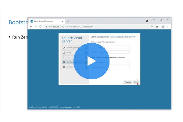 The video shows you how to:Bootstrap the server.Select the Zend Server Profile for the server (Development, Production, or Production on a cluster).Set passwords.View the main green screen menu to start and stop Zend Server.Watch additional videos in the series for Installing Zend Server on IBM i:Introduction and PrerequisitesHome Directory SetupSetting Path & ProfileNot a Zend Server customer? You can try it free.