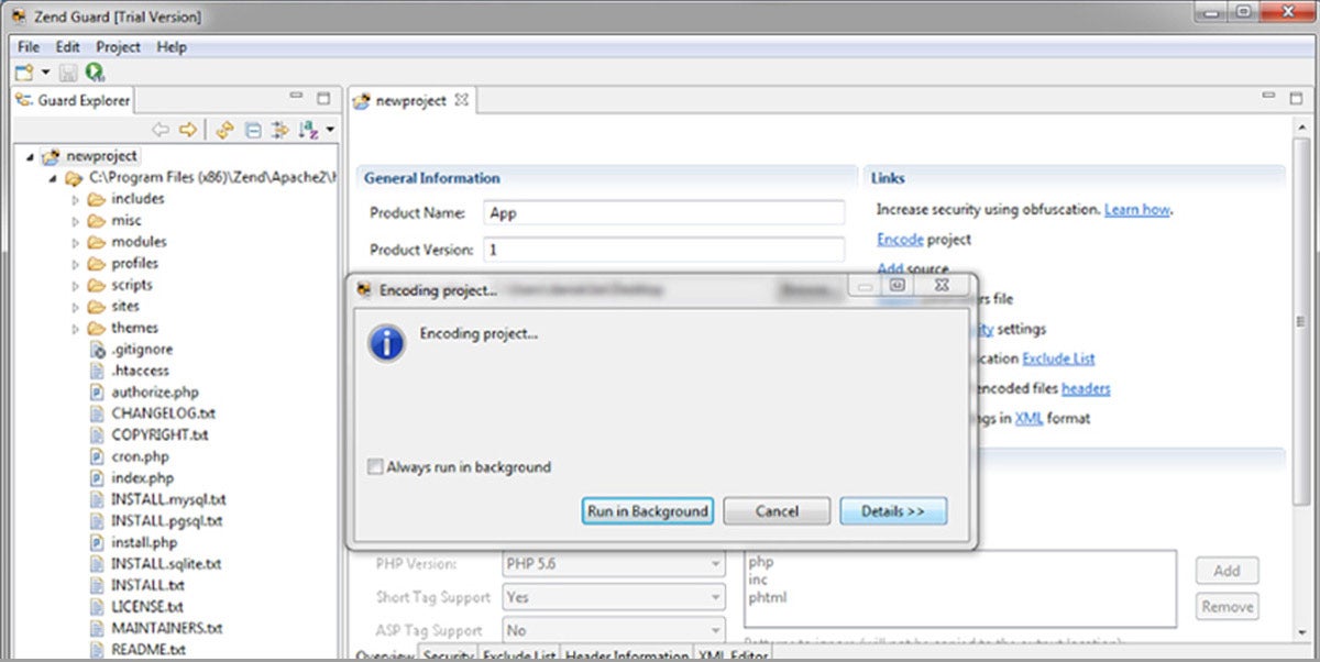 Protecting PHP CodeWith Zend Guard, you can encode, obfuscate and protect your PHP code to prevent unlicensed use and reverse engineering.Zend Guard maximizes software profitability by:Limiting unauthorized duplication or use of your applications.Ensuring only licensed customers use your products — in a way that complies with your license.Supporting flexible licensing terms to minimize product costs.Preventing other people from changing your code.Zend Guard supports PHP versions up through 5.6. Please read this blog for more information. DOWNLOAD ZEND GUARDPHP Encryption and PHP Obfuscation Solution FeaturesEncodingWith Zend Guard, developers can encode their PHP script at any time during the development process, protecting PHP code prior to distribution or publishing. ObfuscationYou can prevent external code tampering by using obfuscation in Zend Server. It converts tags and names in code files into cryptic names. As a result, external parties will not be able to easily understand your code, yet your applications will run successfully.LicensesChoose a license model that meets your requirements. Options include number of concurrent users or specific amounts of time, network segments, or servers.Prevent Reverse EngineeringYou worked hard to develop your code. Now you need to protect it. Zend Guard's powerful encoding and obfuscation technologies prevent reverse engineering, copyright infringement, and unauthorized modification of your code.Encoding is a process where the PHP source code is converted to an intermediate machine readable format, just like PHP encryption. This format is hard for humans to read and convert back to source code. As a result it protects your code from casual browsing. This means that if people obtain access to your site's code they will not be able to use that for unintended purposes.Obfuscation is a process where the code is intentionally made very hard to read as source code or as reverse engineered code. This obfuscation is designed to manage risks that stem from unauthorized access to source code. These risks include loss of intellectual property, ease of probing for application vulnerabilities and loss of revenue that can result when applications are reverse engineered, modified to circumvent licensing and then recompiled. Although reverse engineering always existed in computer software, it is especially important for in computing environments such as PHP which take advantage of dynamic processing of language elements rather than code which has been compiled into machine language before being deployed.Protect Your PHP Code from Unauthorized UseZend Guard's licensing capabilities allow Independent Software Vendors to create a variety of licensing policies for their commercial PHP applications. The product supports most commonly used licensing models such as concurrent users, time limited, segment of network, or server specific licensing. These capabilities allow vendors to maximize their revenue by preventing unauthorized use. PHP EncoderCompiles and converts the plain-text PHP scripts into a platform-independent binary format known as a 'Zend Intermediate Code' file. These encoded binary files can then be distributed instead of the plain text PHP protecting your hard programming efforts. Benefits of using this PHP encrypt process:Prohibits modification of internal PHP application source code.Supports one-click encoding from Zend Studio.Auto-detects and suggests PHP code elements (such as functions and methods) to exclude them from being obfuscated, significantly reducing development time.PHP Encoding and PHP Obfuscation License ManagerThe Zend Guard License Manager both strengthens protection and enhances revenue generation opportunities.Choose from a variety of licensing models such as concurrent users, time limited, segment of network, or server specific.How the PHP Encoder and PHP Obfuscator WorksThe license file, deployed along with the encoded PHP, is validated at runtime. Licenses can be easily modified or renewed, without the need to deploy new software. Vendors can pick-and-choose from a variety of flexible licensing models:Concurrent Users: Usage is limited by the number of real-time users.Time Limited: A time-limited license used for evaluation purposes or time dependent terms, with pre-set expiration dates.Segment of Network: Usage is limited by IP address range, restricting licenses according to network topology.Specific Server: License limited to specific hardware, based on Host ID.Advanced Options: Specify advanced licensing options by adding custom code.DOWNLOAD ZEND GUARDWhat's New With the PHP Encoding and PHP Obfuscation SolutionChanges in Zend Guard from Version 6.0 to 7.0Full support for PHP 5.5 and 5.6.Changes in Zend Guard from Version 5.5 to 6.0Full support for PHP 5.4.See Release NotesChanges in Zend Guard from Version 5.0.1 to 5.5Full support for PHP 5.3.System RequirementsSupported Operating Systems: Linux x86.Linux x86-64 with 32 bit libraries installed.Windows x86 7 / 8.1 / 2008R2.Windows x86-64 7 / 8.1 / 2008R2.Mac OS X 10.10.Supported PHP Versions: 5.3.x through 5.6 (using Zend Guard Loader as the runtime PHP decoder).4.2.x through 5.2.x (using Zend Optimizer as the runtime PHP decoder).Zend Server TrialStart your free 30-day trial to see how you can increase PHP app performance, security, and scalability with Zend Server.TRY FOR FREEEnterprise ServicesReview your support and service options.See ServicesContact UsGet answers to your questions.Talk to an Expert
